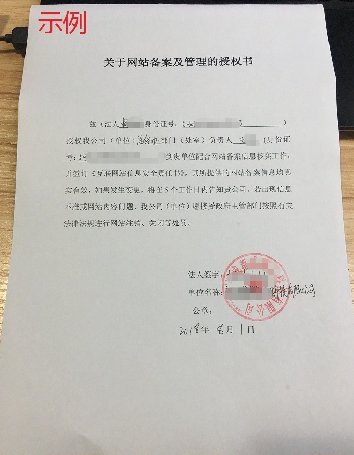 6、企业备案如果是网站管理人员拍照还需要提供授权书加盖公章,法人本人拍照亲自办理则不需要此项;